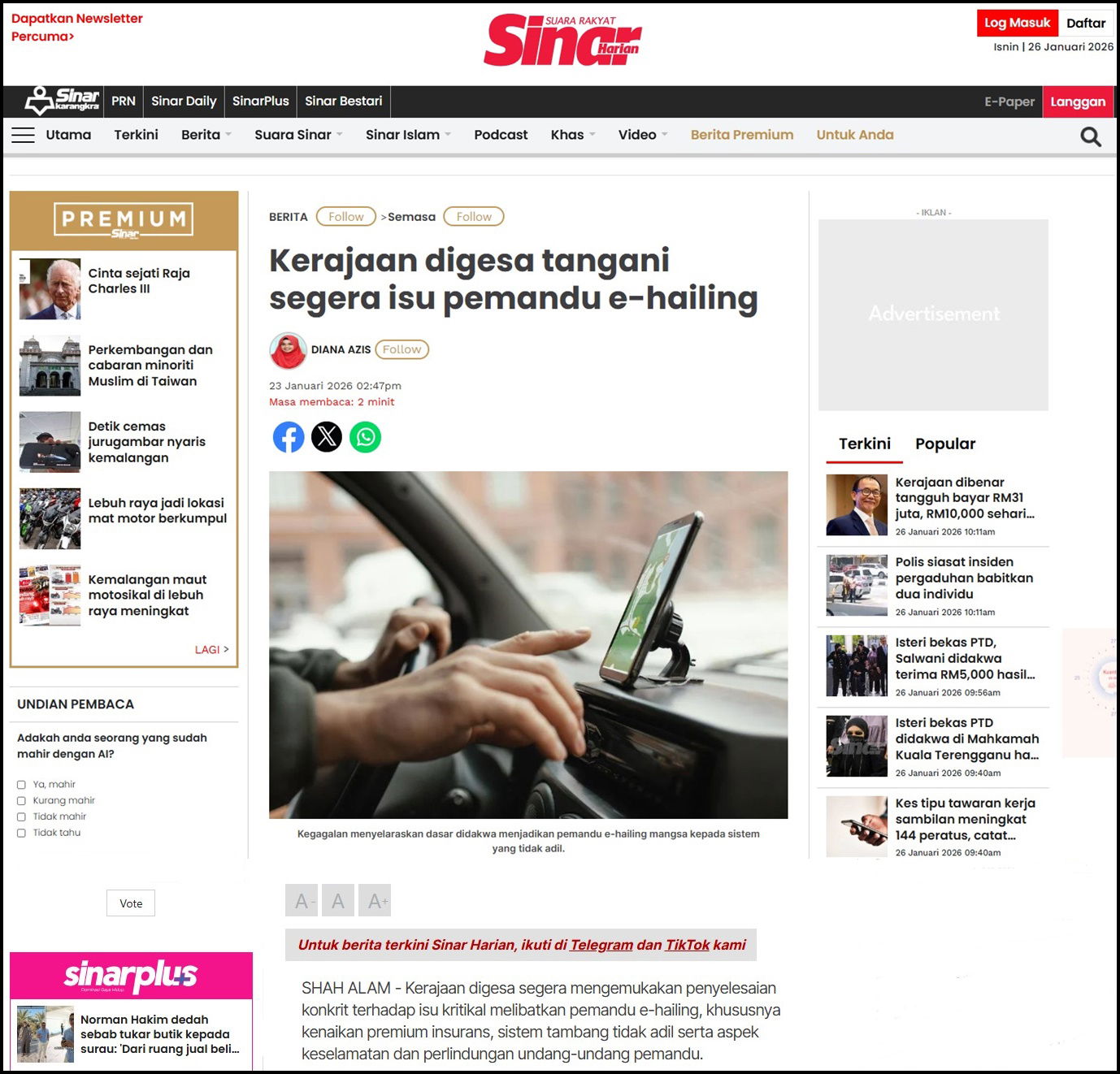 SHAH ALAM - Kerajaan digesa segera mengemukakan penyelesaian konkrit terhadap isu kritikal melibatkan pemandu e-hailing, khususnya kenaikan premium insurans, sistem tambang tidak adil serta aspek keselamatan dan perlindungan undang-undang pemandu.