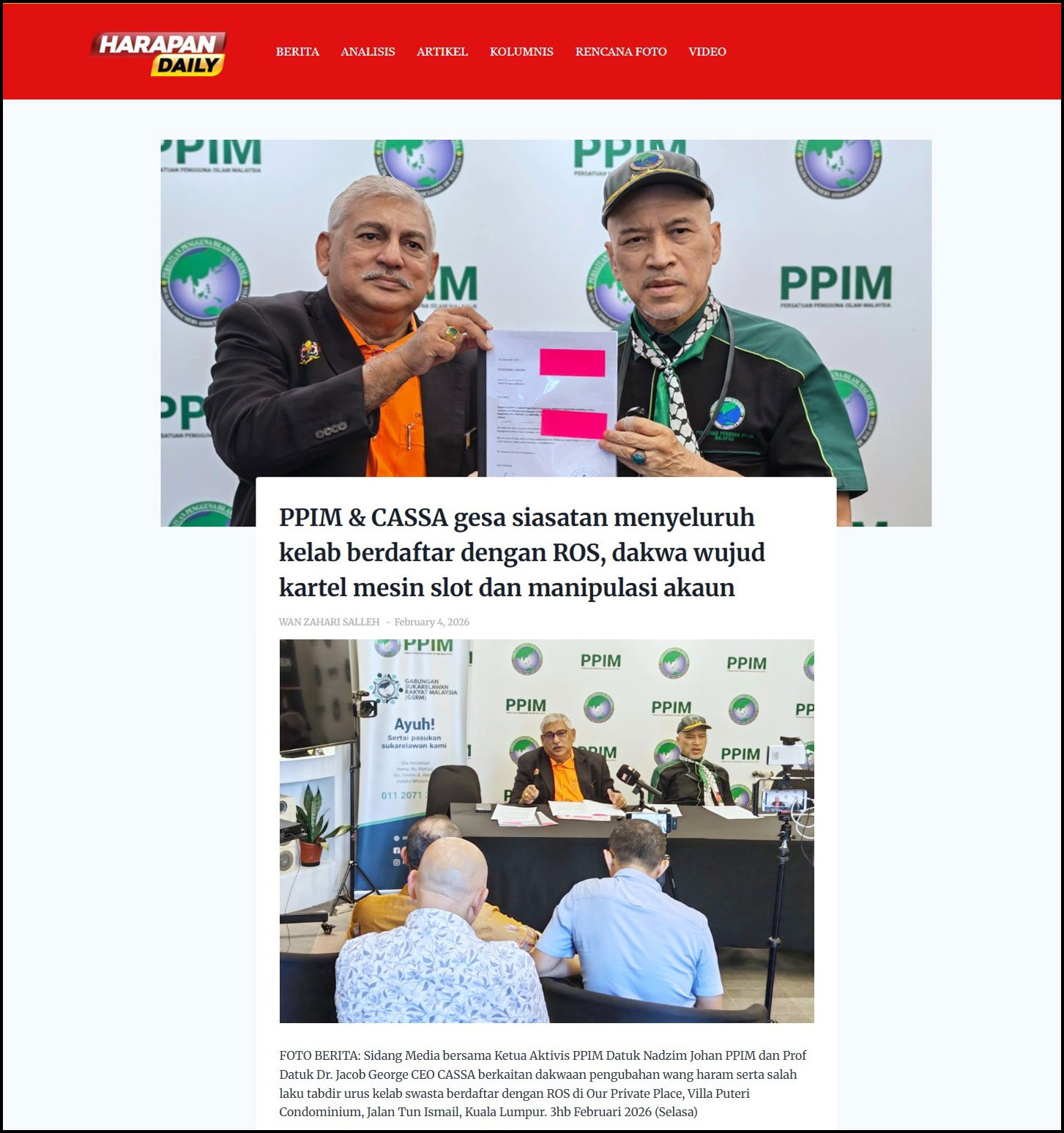 PPIM & CASSA GESA SIASATAN MENYELURUH KELAB BERDAFTAR DENGAN ROS, DAKWA WUJUD KARTEL MESIN SLOT DAN MANIPULASI AKAUN