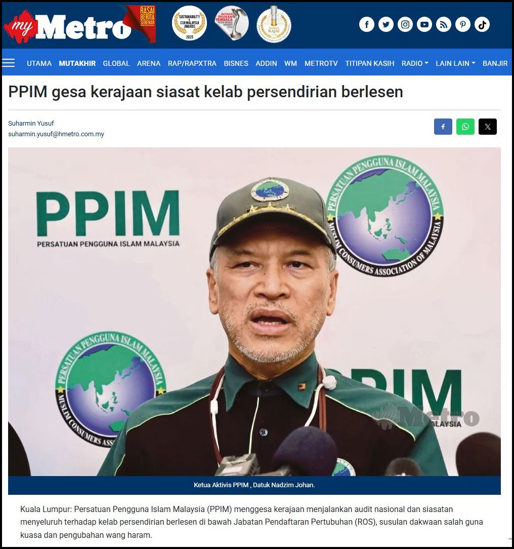 Kuala Lumpur: Persatuan Pengguna Islam Malaysia (PPIM) menggesa kerajaan menjalankan audit nasional dan siasatan menyeluruh terhadap kelab persendirian berlesen di bawah Jabatan Pendaftaran Pertubuhan (ROS), susulan dakwaan salah guna kuasa dan pengubahan wang haram.
