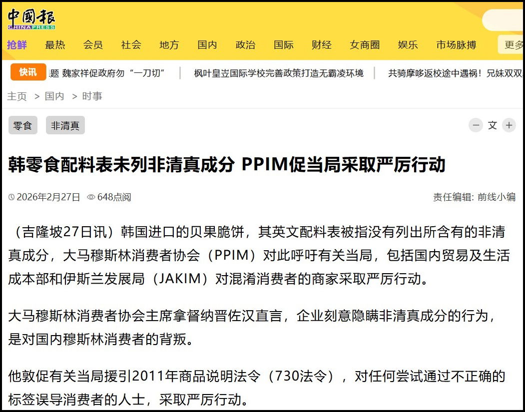 SNEK KOREA TIDAK MENYENARAIKAN BAHAN TIDAK HALAL DALAM LABEL RAMUAN, PPIM GESA PIHAK BERKUASA AMBIL TINDAKAN TEGAS