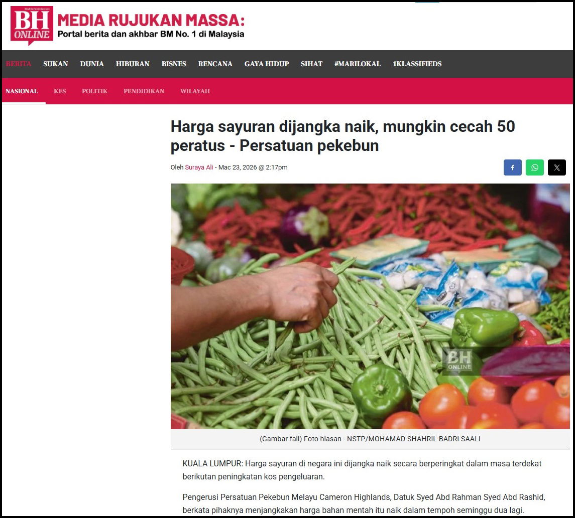HARGA SAYURAN DIJANGKA NAIK, MUNGKIN CECAH 50 PERATUS - PERSATUAN PEKEBUN