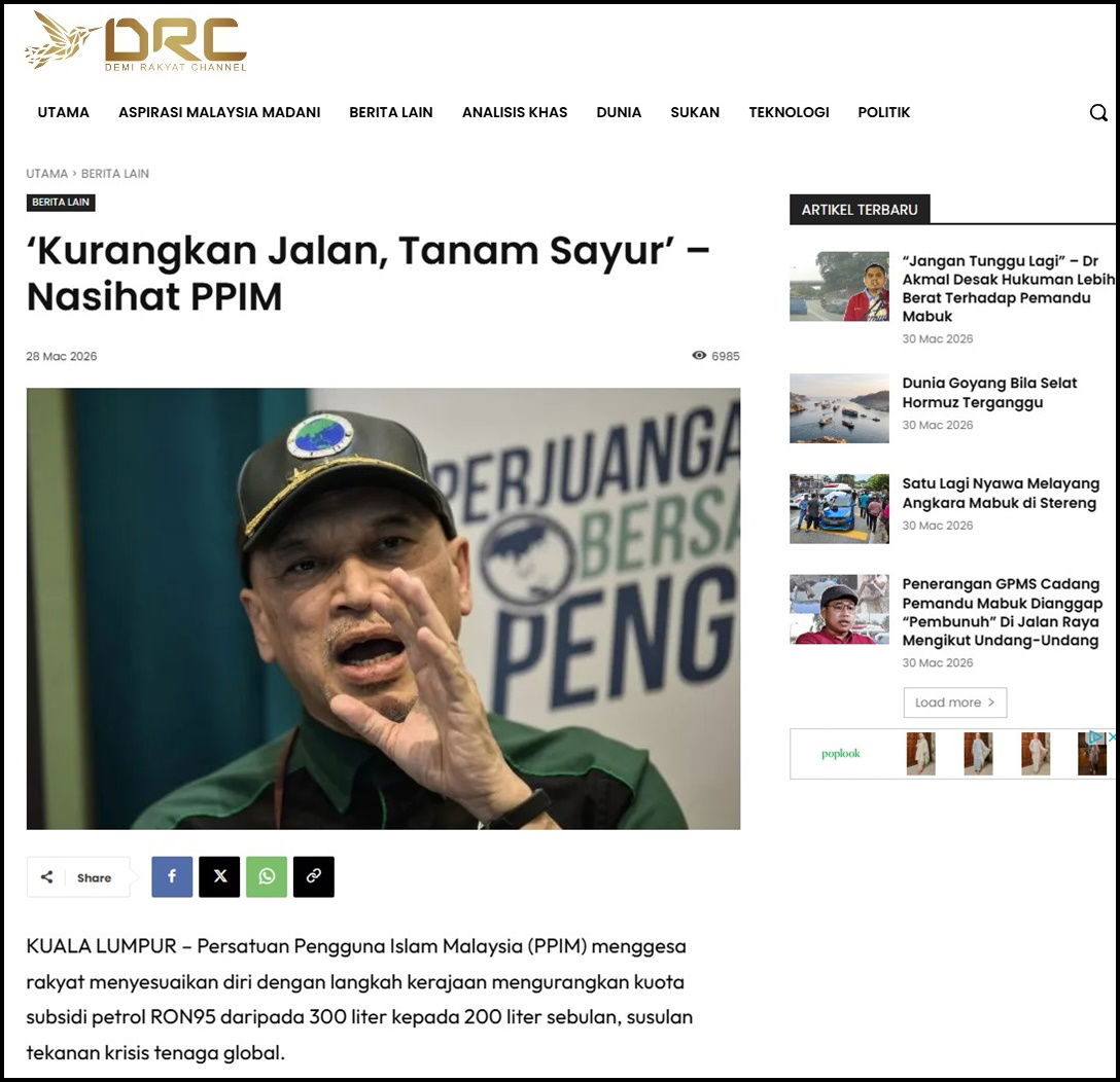 KUALA LUMPUR – Persatuan Pengguna Islam Malaysia (PPIM) menggesa rakyat menyesuaikan diri dengan langkah kerajaan mengurangkan kuota subsidi petrol RON95 daripada 300 liter kepada 200 liter sebulan, susulan tekanan krisis tenaga global.
