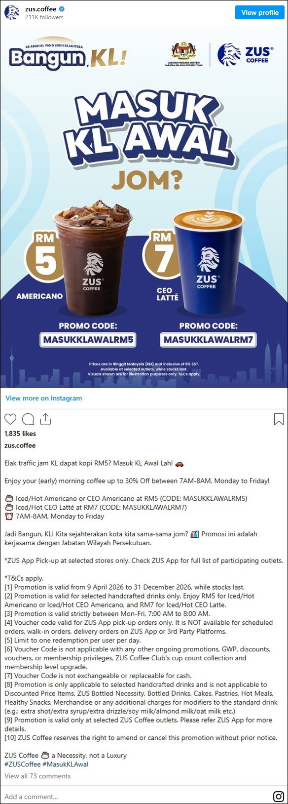 To incentivise commuters to start their day earlier, the government has partnered ZUS Coffee, a home-grown coffee chain, to offer early-bird discounts between 7am and 8am at its 250 outlets across KL and Putrajaya until the end of 2026.