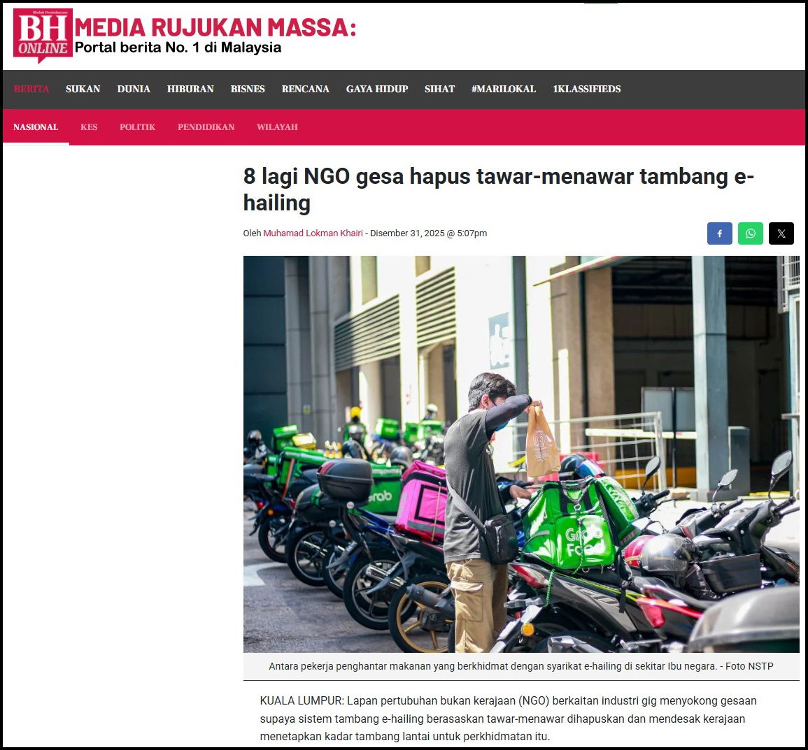 KUALA LUMPUR: Lapan pertubuhan bukan kerajaan (NGO) berkaitan industri gig menyokong gesaan supaya sistem tambang e-hailing berasaskan tawar-menawar dihapuskan dan mendesak kerajaan menetapkan kadar tambang lantai untuk perkhidmatan itu.