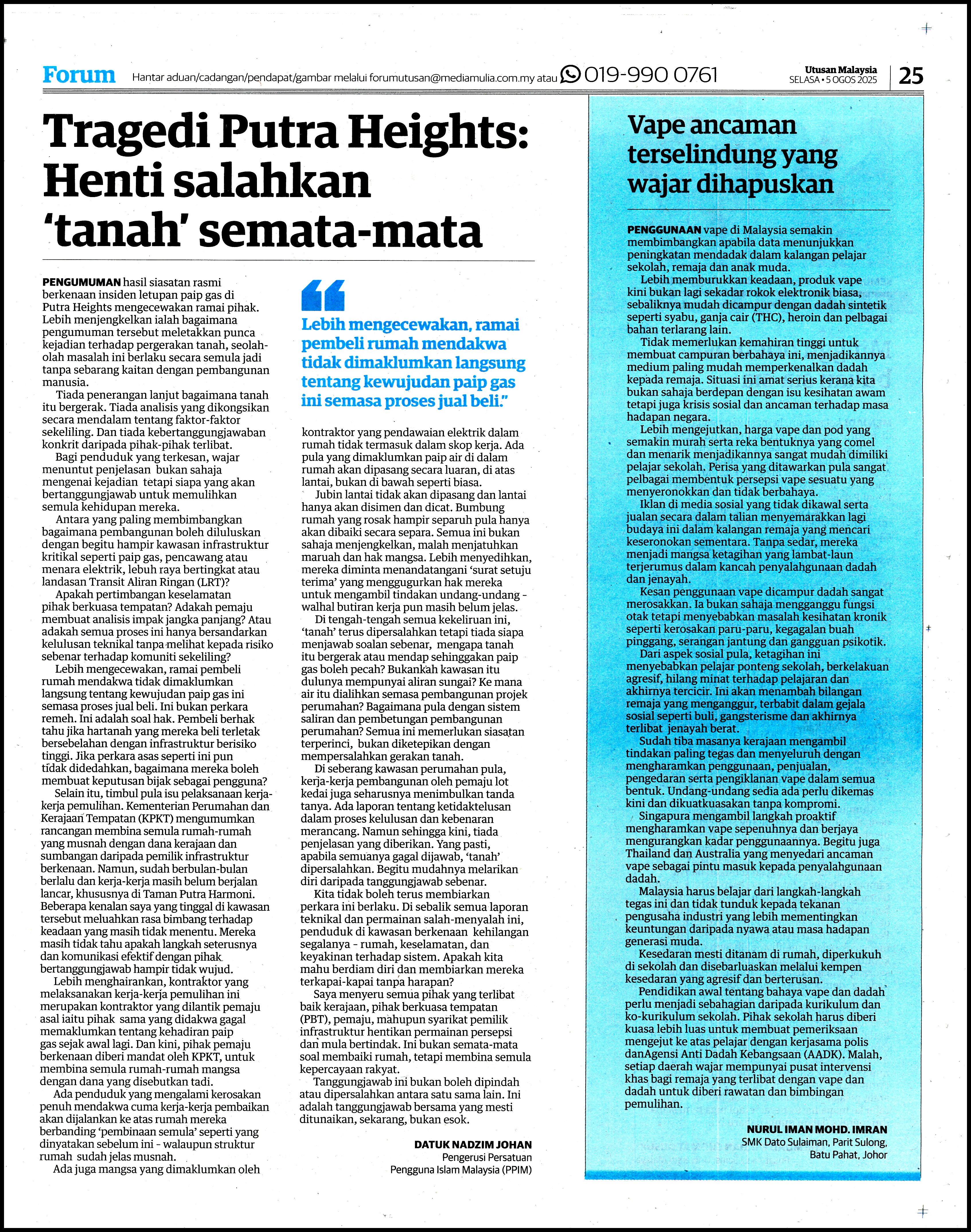Kita tidak boleh terus membiarkan perkara ini berlaku. Di sebalik semua laporan teknikal dan permainan salah-menyalah ini, penduduk di kawasan berkenaan kehilangan segalanya – rumah, keselamatan, dan keyakinan terhadap sistem. Apakah kita mahu berdiam diri dan membiarkan mereka terkapai-kapai tanpa harapan?