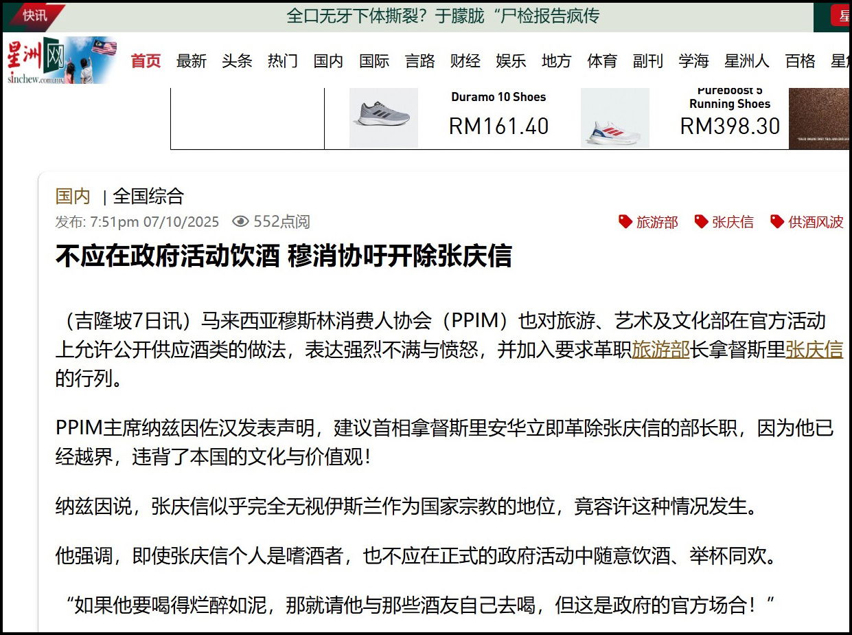 (Kuala Lumpur, 7hb) Persatuan Pengguna Islam Malaysia (PPIM) turut menyatakan rasa tidak puas hati dan marah terhadap tindakan Kementerian Pelancongan, Seni dan Budaya yang membenarkan penyediaan minuman beralkohol secara terbuka dalam satu acara rasmi, dan menggesa Perdana Menteri Anwar Ibrahim memecat Menteri Pelancongan Tiong King Sing.