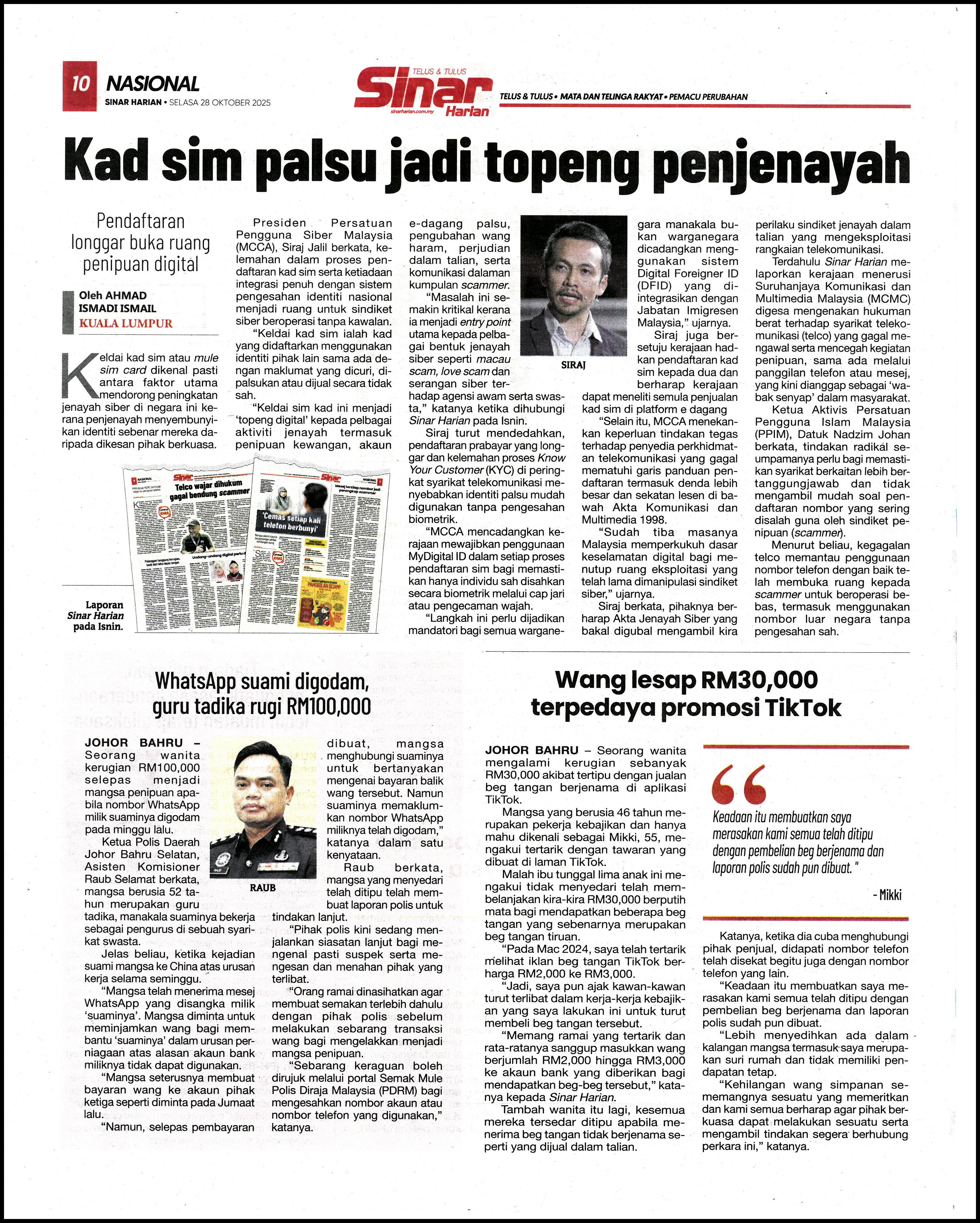 Presiden Persatuan Pengguna Siber Malaysia (MCCA), Siraj Jalil berkata, kelemahan dalam proses pendaftaran kad sim serta ketiadaan integrasi penuh dengan sistem pengesahan identiti nasional menjadi ruang untuk sindiket siber beroperasi tanpa kawalan.