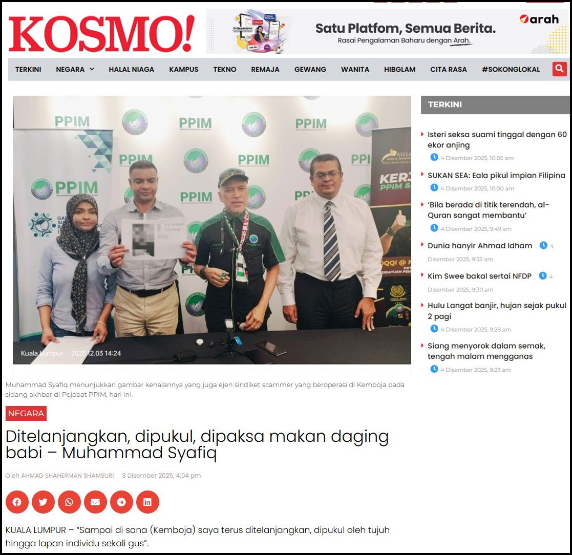 Demikian penderitaan yang dialami seorang ahli perniagaan, Muhammad Syafiq Pubalan Abdullah selepas menjadi mangsa sindiket penipuan atau scammer di sebuah kawasan di Kemboja hampir sebulan lalu.