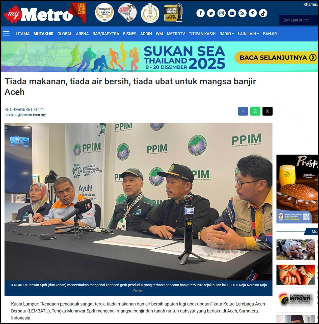 Kuala Lumpur: "Keadaan penduduk sangat teruk, tiada makanan dan air bersih apatah lagi ubat-ubatan," kata Ketua Lembaga Aceh Bersatu (LEMBATU), Tengku Munawar Spdi mengenai mangsa banjir dan tanah runtuh dahsyat yang berlaku di Aceh, Sumatera, Indonesia.