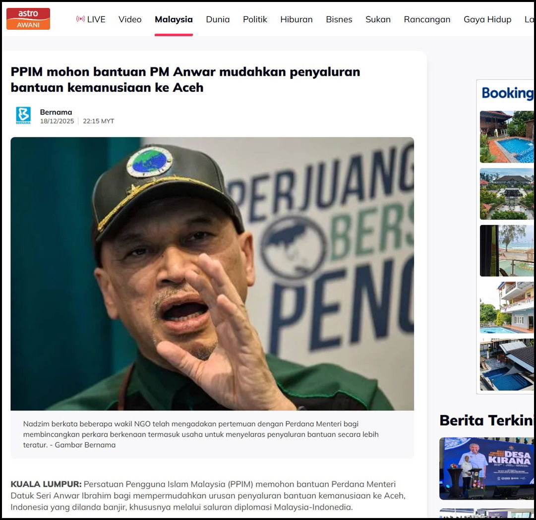 KUALA LUMPUR: Persatuan Pengguna Islam Malaysia (PPIM) memohon bantuan Perdana Menteri Datuk Seri Anwar Ibrahim bagi mempermudahkan urusan penyaluran bantuan kemanusiaan ke Aceh, Indonesia yang dilanda banjir, khususnya melalui saluran diplomasi Malaysia-Indonedia.