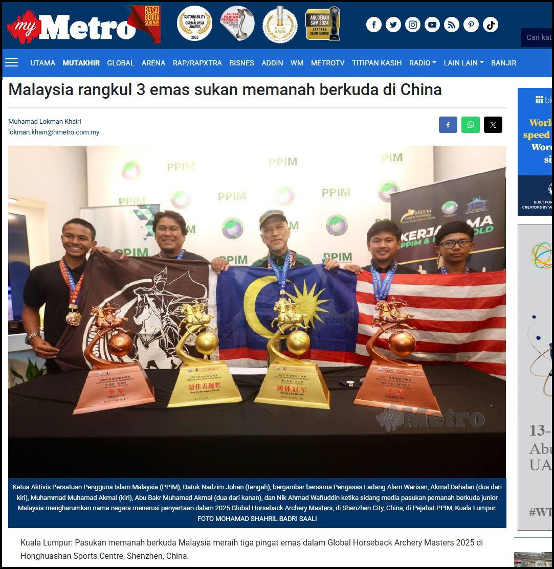 Kuala Lumpur: Pasukan memanah berkuda Malaysia meraih tiga pingat emas dalam Global Horseback Archery Masters 2025 di Honghuashan Sports Centre, Shenzhen, China.