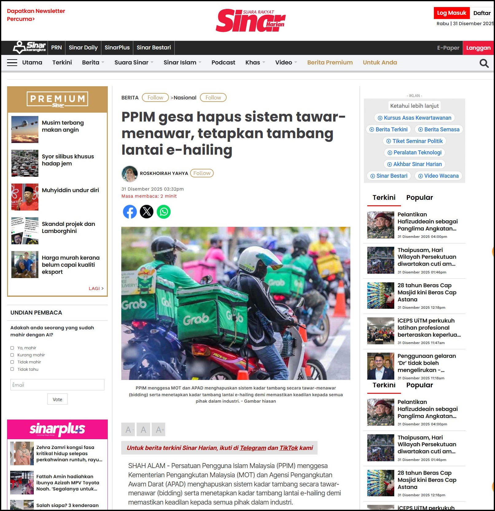 PPIM GESA HAPUS SISTEM TAWAR-MENAWAR, TETAPKAN TAMBANG LANTAI E-HAILING