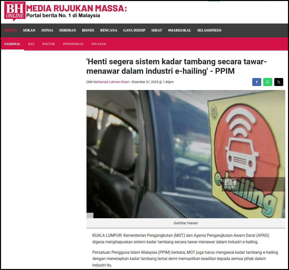 'HENTI SEGERA SISTEM KADAR TAMBANG SECARA TAWAR-MENAWAR DALAM INDUSTRI E-HAILING' - PPIM